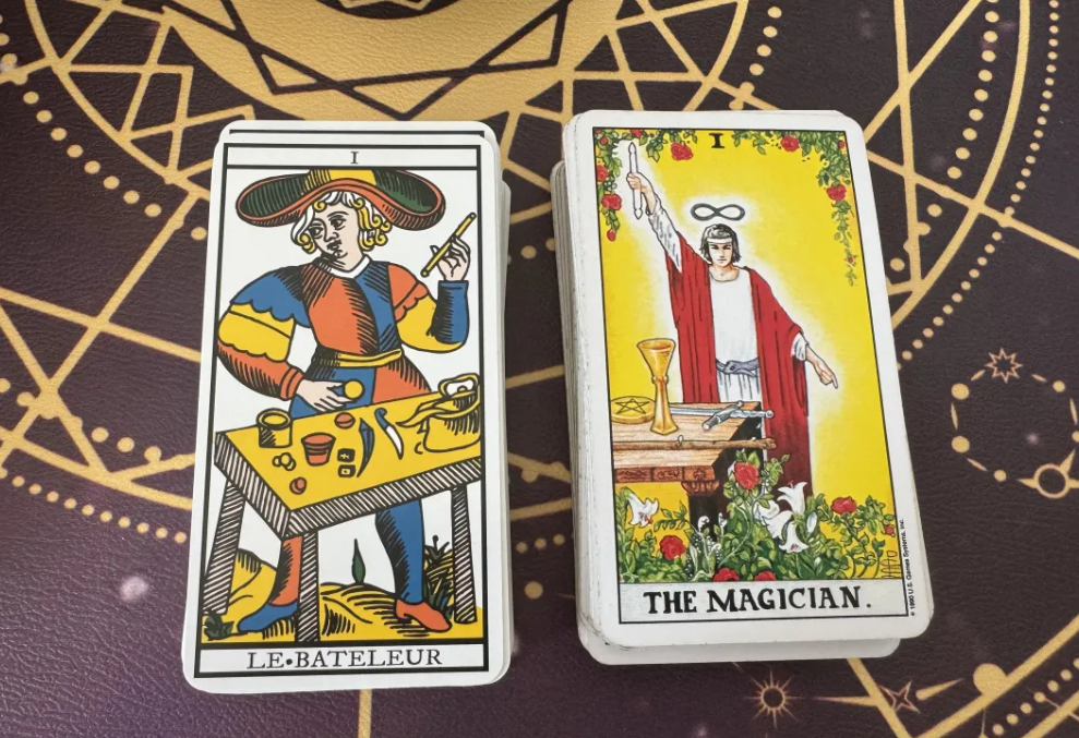 左边是马赛塔罗,翻译为街头艺人;右边是韦特塔罗,翻译为魔术师