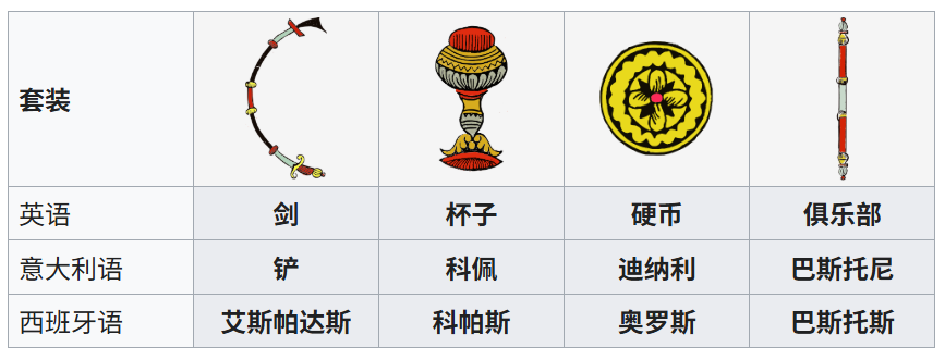 - 马赛塔罗: “花牌”或“扑克牌式”。除了宫廷牌外,数字牌(如权杖三、圣杯五)只有相应数量的符号元素排列,没有具体的场景和人物故事。