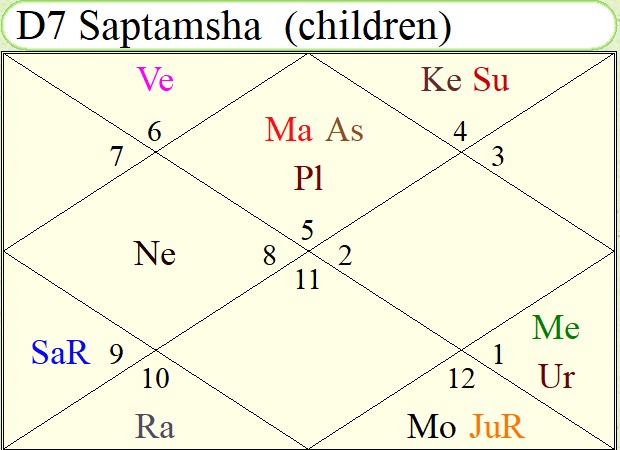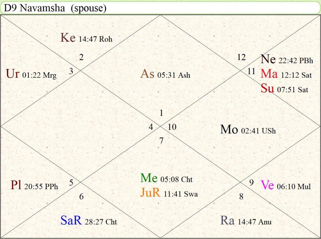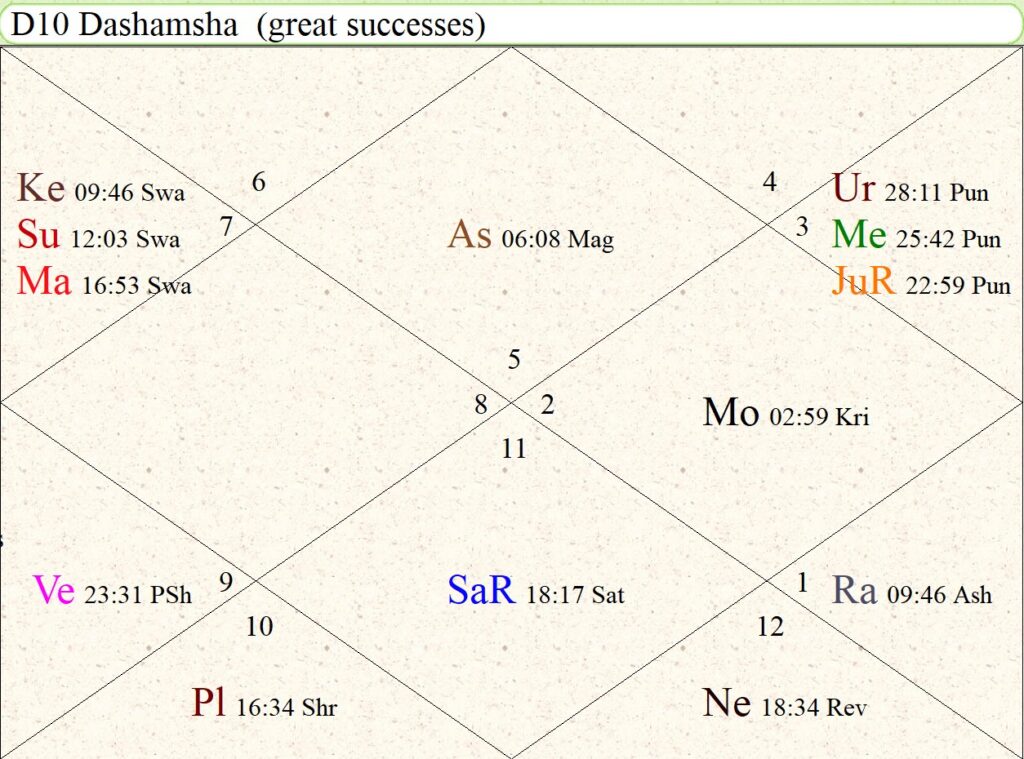 印占/吠陀占星盘:上升狮子座,上升月宿在Mag(前面案例马克龙的命主星月宿在Mag),土星罗喉入命,Ke对自己有强相位影响;月亮处女座,本命月宿在UPh。强调下木星在巨蟹座逆行落12宫,在海外影响力大,粉丝量巨大。