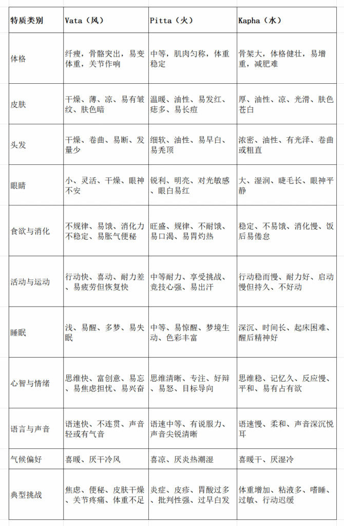 双重平衡型:有两栏勾选数非常接近且明显高于第三栏(例如:Pitta-9, Kapha-8, Vata-3)。你的体质是这两种能量的混合(如 Pitta-Kapha型)。通常排第一的为主导能量,第二为次要能量。